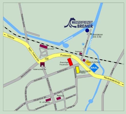 In Malchin biegen Sie auf der B 104 gegenüber der Freiwilligen Feuerwehr, in unmittelbarer Nähe der ARAL-Tankstelle, in Richtung Norden ab. Hinter dem Bahnübergang befinden Sie sich auf der Halbinsel und dem Wasserwanderrastplatz „Koesters Eck“, wo Sie direkt am Zusammenfluss der West- und der Ostpeene die Malchiner WASSERFREIZEIT BREMER finden.