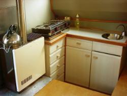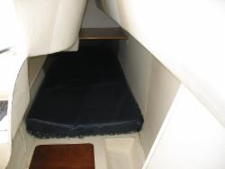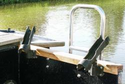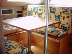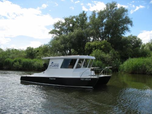 ist ein führerscheinfreie Motorkatamaran und für die Bedürfnisse de Angelsportes ausgestattet. Durch seine Breite liegt er ruhig auf dem Wasser und bietet bis zu 4 Personen platz zum angeln.In der Kajüte befinden sich zwei Einzelschlafplätze und eine Sitzgruppe, die zum Doppelbett umgebaut werde kann.Schlafsäcke und Decken müssen mitgebracht werden. Die kleine Küche ist mit einem 2-flammigen Kocher, Spüle und einer elektrischen Kühlbox ausgestattet. Töpfe, Pfannen, Besteck und Geschirr sind natürlich an Bord. Für die kühleren Tage ist eine kleine Ölheizung vorhanden. In einem kleinem Extraraum befindet sich das Marine WC. An Bord befindet sich eine 12v Steckdose zum aufladen von Mobiltelefonen.Eine Solaranlage liefert den den benötigten Bordstrom.Zur Schiffsausrüstung gehören neben Kartenmaterial, Erste-Hilfe-Kasten, Anker,Kompass, Fernglas, Radio, Schwimmwesten auch ein Echolot / Fischfinder und 6 rutenhalter.